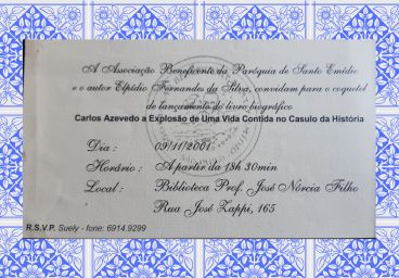 (Pai da 1ª Geração) - Brasil. Minas Gerais. Pouso AlegreCARLOS nasceu a 01.07.1922 na cidade de Pouso Alegre, Minas Gerais. Pertence a 1ª geração brasileira AZEVEDO. Dos sete filhos, é o sexto do casal Antônio Alves de Azevedo, natural do Porto, em Portugal, e de Dinorah Mendel Gay de Azevedo, nascida em Uruguaiana, Rio Grande do Sul, no Brasil. Casou-se em 25.11.1945 com MARIA APARECIDA SIMÕES AZEVEDO, natural de Consolação, Minas Gerais, com quem teve 3 filhos. Antonio Carlos (1946), Paulo Cesar (1947) e Vera Lúcia (1949). Avô de três netas, dois netos e cinco bisnetas. Faleceu no dia 01.03.2003, em Atibaia, São Paulo e encontra-se sepultado no Jazigo da Família SIMÕES em Pouso Alegre ao lado de sua mulher, falecida em 09.06.2011.